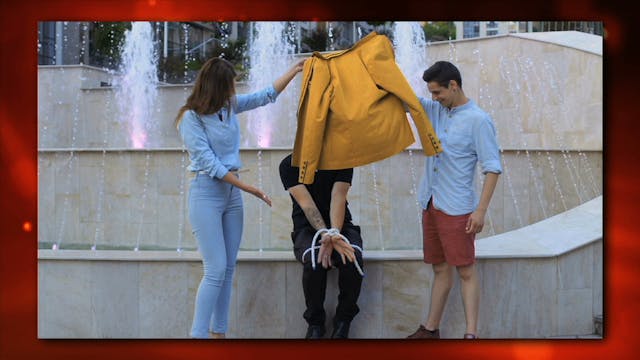 This episode features a street magician performing an illusion with a magic table and an escape from bound ropes.